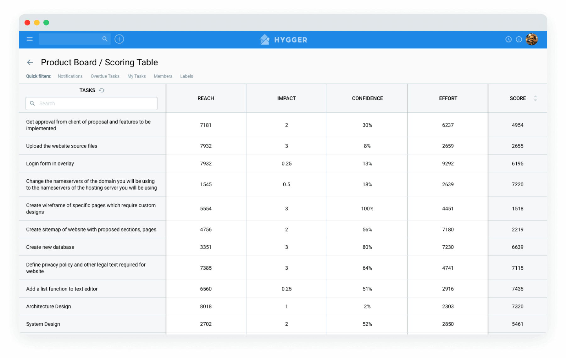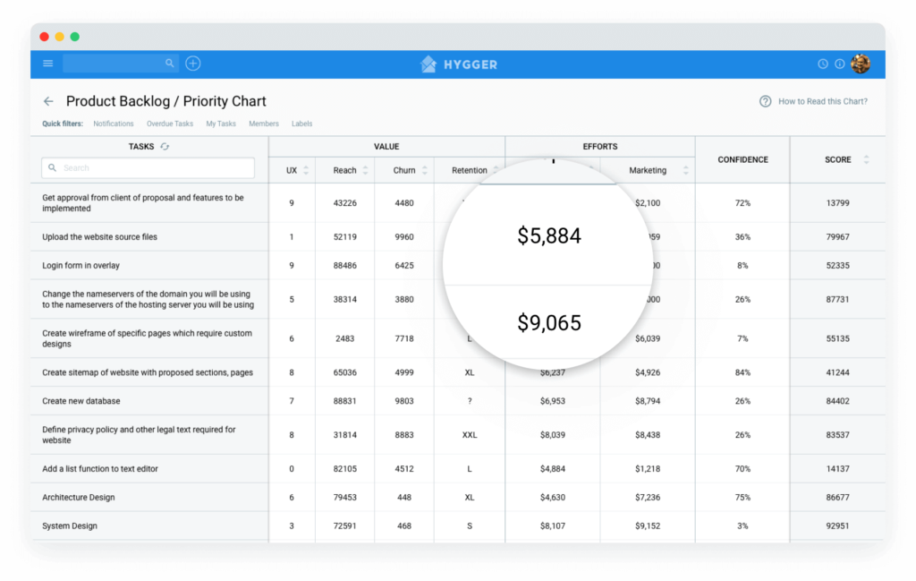 Оцените свои функции, используя популярные методы расстановки приоритетов, которые учитывают четыре основных показателя: Охват, Влияние, Стоимость и Простота.