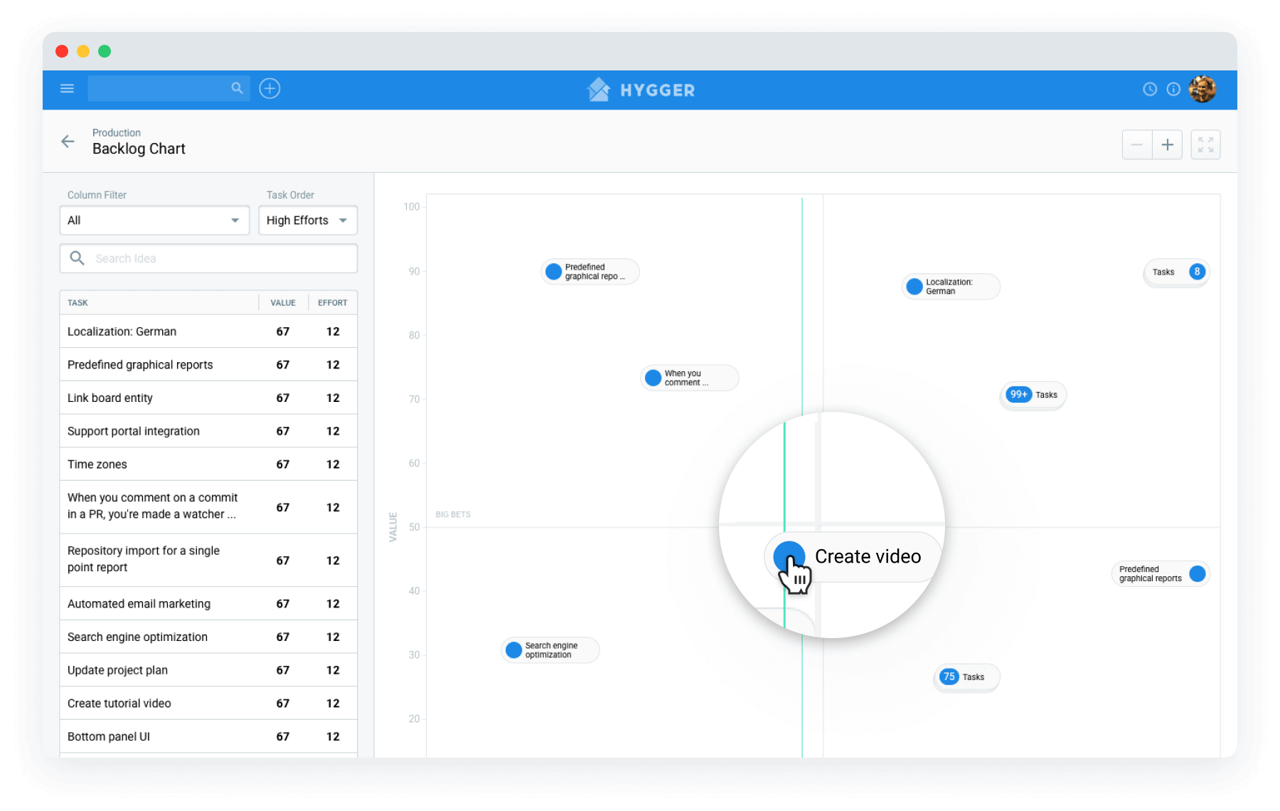 Выберите задачи-победители на диаграмме приоритетов «ценность/затраты». Определите крупные ставки, отсеивайте временные и вероятные.