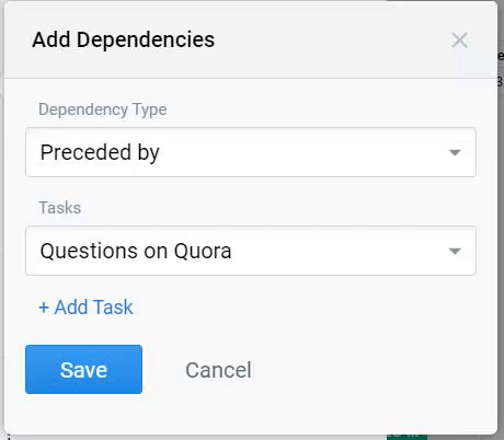 Откройте задачу и нажмите кнопку «Добавить». Вы можете заметить «Зависимость», выберите зависимую задачу и один из типов зависимостей.