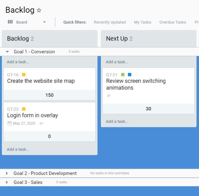 Затем вы можете собрать свои идеи на доске Kanban и назвать ее Backlog. Вы собираете все идеи проекта и расставляете приоритеты, используя один из типов расстановки приоритетов: Ценность/затраты, Ценность/риск, Взвешенная оценка, матрица Эйзенхауэра, ICE или RICE. Вы даже можете модифицировать матрицу приоритетов 2×2 в соответствии с тем, как вы хотите оценивать свои задачи. Свимланы, как и группы, будут представлять ваши цели.