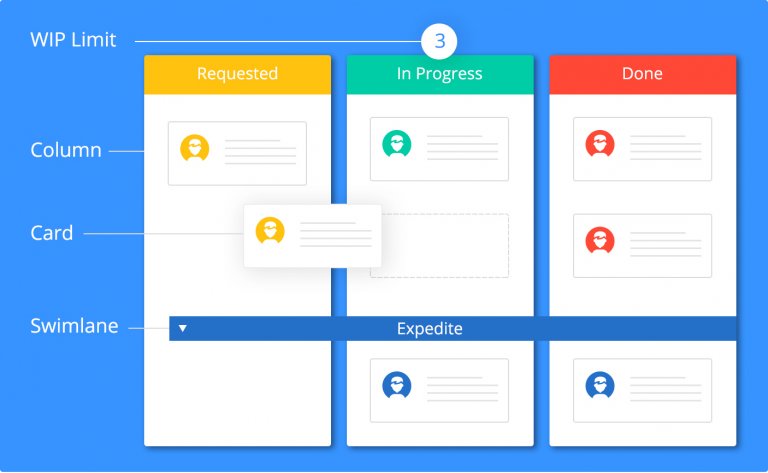 Колонки представляют собой поток создания ценности. Речь идет о последовательности определенных шагов, через которые должны пройти задачи от начала работы до ее завершения. Вы размещаете рабочие элементы на карточках и кладете их в соответствующие колонки. Карточки имеют несколько цветов и используются для разных типов рабочих элементов. Горизонтальные ряды — Swimlanes — используются для организации команд, работающих на одной доске. Некоторые столбцы имеют ограничение по вместимости. Это гарантирует плавный рабочий процесс, и члены команды тянут карточки, перемещая их по столбцам слева направо.