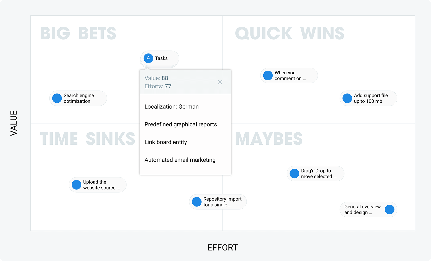 Используйте встроенную систему приоритетов, чтобы определить, какие задачи должны быть выполнены в первую очередь. Оцените их по параметрам «ценность/затраты» и выберите победителей на матрице приоритетов 2×2. Кроме того, вы можете использовать любую другую технику расстановки приоритетов, которая соответствует вашим бизнес-целям: Взвешенная оценка, Эйзенхауэр, ICE, RICE и т. д.