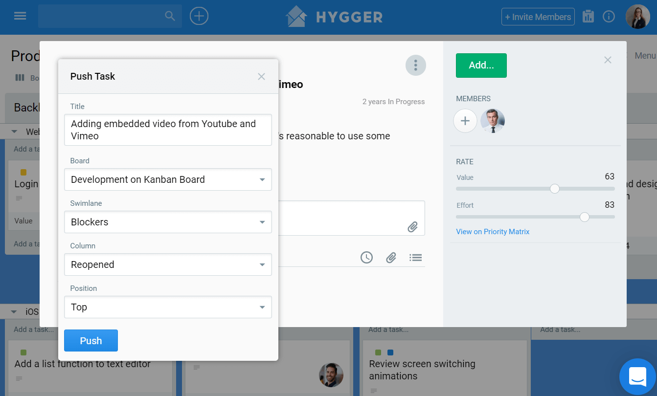 Используйте опцию Push для отслеживания стадии разработки вашей идеи. Одним щелчком мыши отправьте задачу с доски Backlog на доску Sprint/Kanban или непосредственно в Jira. Эти задачи будут находиться в автосинхронизации: когда задача будет разработана, исходная задача будет отмечена как Выполнена.