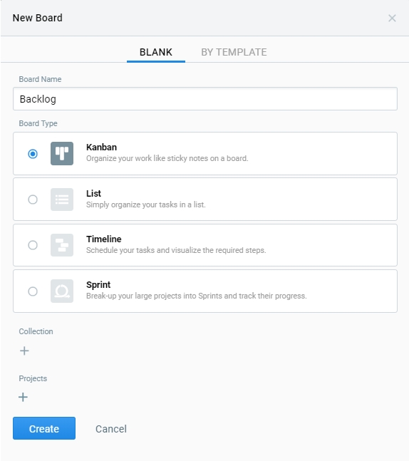 Вы увидите список типов досок, выберите Kanban и назовите ее «Backlog».