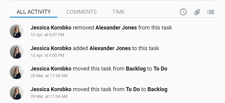 Все ваши действия, все добавленные вложения, все журналы будут находиться в разделе «Все действия». Здесь вы увидите, кто создал задачу и кто добавил ее в колонку «Выполнено». Это поможет вам увидеть внесенные изменения и ответственного за них человека.