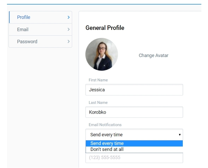 Под именем и фамилией вы можете заметить Уведомления по электронной почте и две опции в них: «Отправлять каждый раз» и «Не отправлять вообще». Пожалуйста, выберите второй вариант, чтобы перестать забрасывать вашу почту уведомлениями.